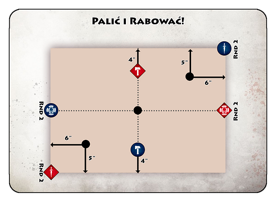 Przed bitwą rozkładamy trzy Stosy Łupów (po prostu Objective) tak jak przedstawione jest na planie. Wojownik w 1 calu od Stosu może go przeszukać kosztem jednej akcji, jeśli to zrobi automatycznie niesie Skarb, Skarbu nie można dobrowolnie upuścić kosztem akcji. Jeżeli Stos przeszuka wojownik nie mogący nosić Skarbów, automatycznie upuszcza Skarb bez wydawania akcji. Po tym gdy Stos zostanie przeszukany drugi raz, zostaje podpalony (oznaczamy to żetonikiem lub w inny sposób) i nie można go już przeszukiwać. Każdy model, znajdujący się w 3 calach od podpalonego Stosu na koniec rundy, otrzymuje 1k6 obrażeń.