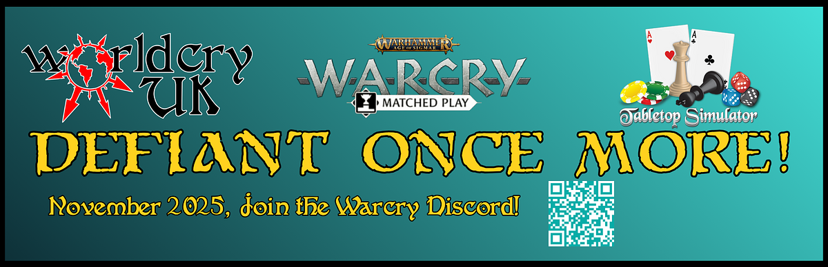 Tournament Name: WorldCryUK Returns: Defiant Once More! TableTop Simulator Edition Managed by:Phylax [WorldCryUK/Wild Dice] Location:Online When:03 Nov 2025 Rounds:4 Players:12 / 32 Status: Unstarted More info:https://drive.google.com/file/d/1cJbN-87xXS_yPiz_JN_gWqPcGhTW-JvF/view