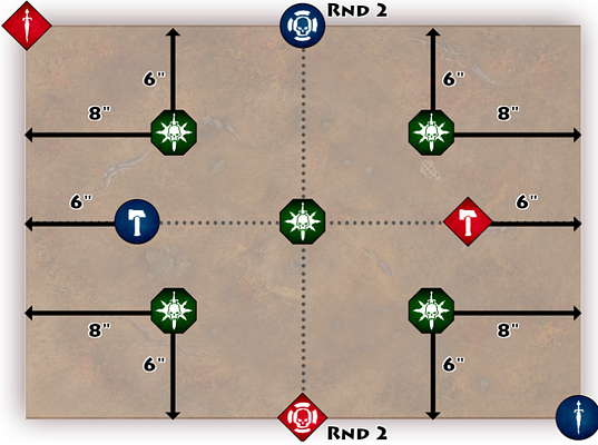 Platziere 5 Missionsziele auf einer Plattform oder direkt auf dem Spielfeldboden, wie auf der Einsatzkarte dargestellt.